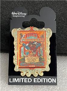The front reads "Caribbean Plaza", the text reads "Sail with the wildest crew that ever sacked the Spanish Main." It has a yellow background with a blue dress pirate, red writing, and a blue background behind the writing. Beneath the pirate there different scenes from PotC are depicted. the picture has a red border and then the scroll type frame which is light blue and silver. Right at the bottom it reads "Walt Disney World." It depicts a poster for the WDW Magic Kingdom attraction.