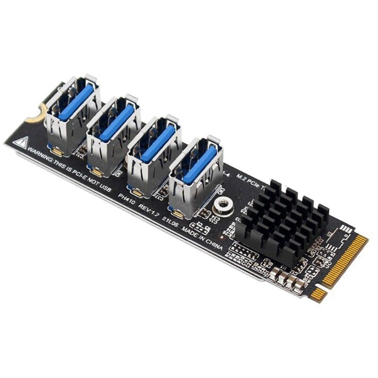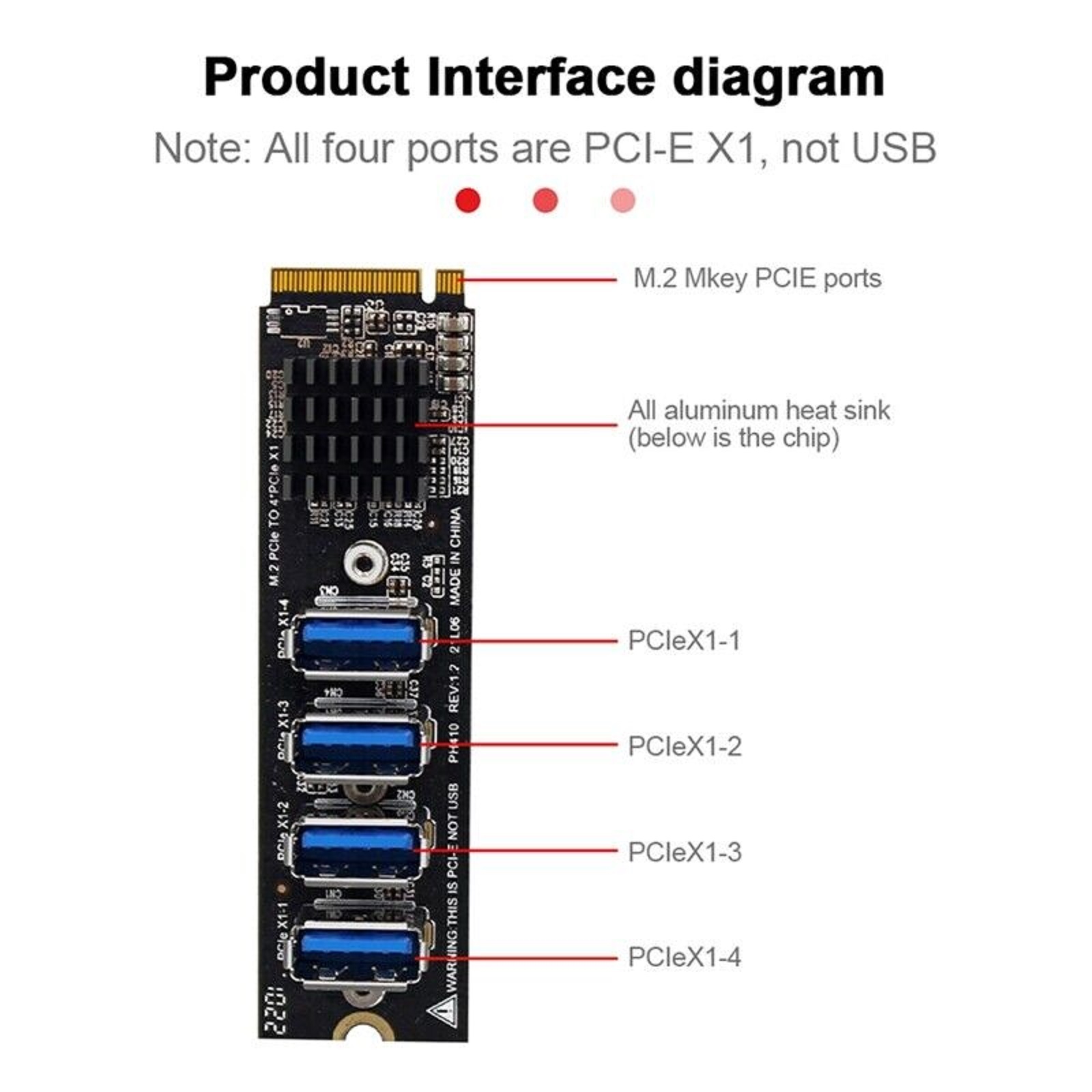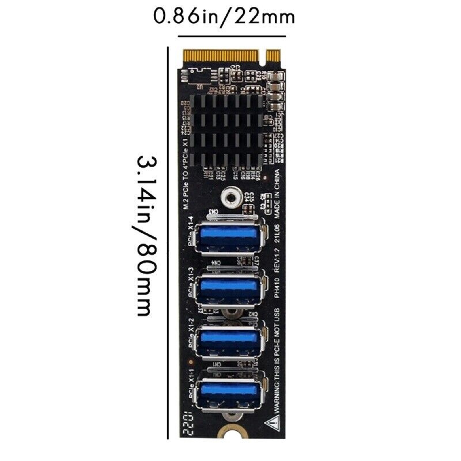 Specification: Product Name: USB 3.0 PCI-E Riser Interface type: M.2 M Key PCIE Number of interfaces: PCIE X1 x 4 Applicable system: for Mac os /Windows / Linux colour: black Material: metal + plastic