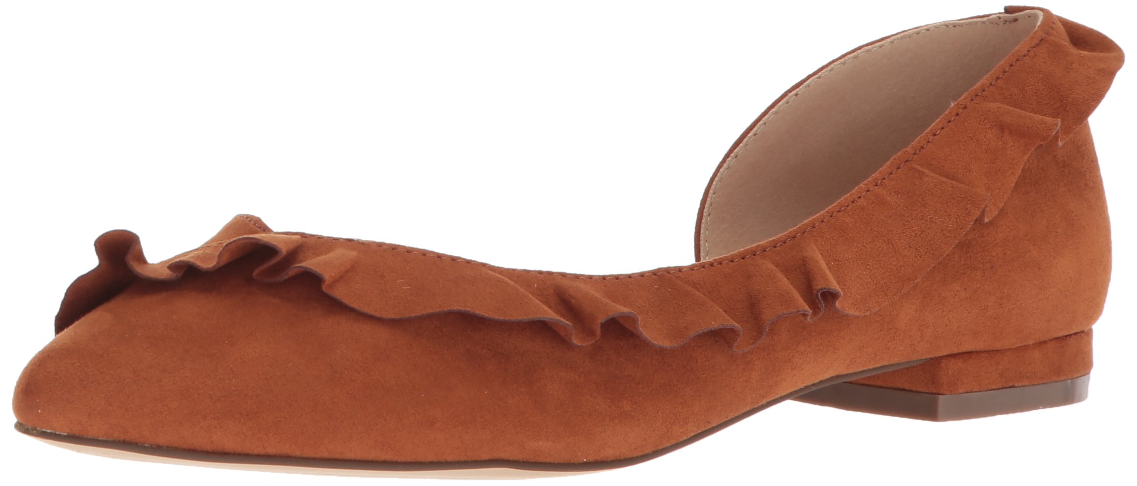 Updated ballet flat with half dorsay styling and self ruffle trim. 1/2 covered heel with padded insole.
