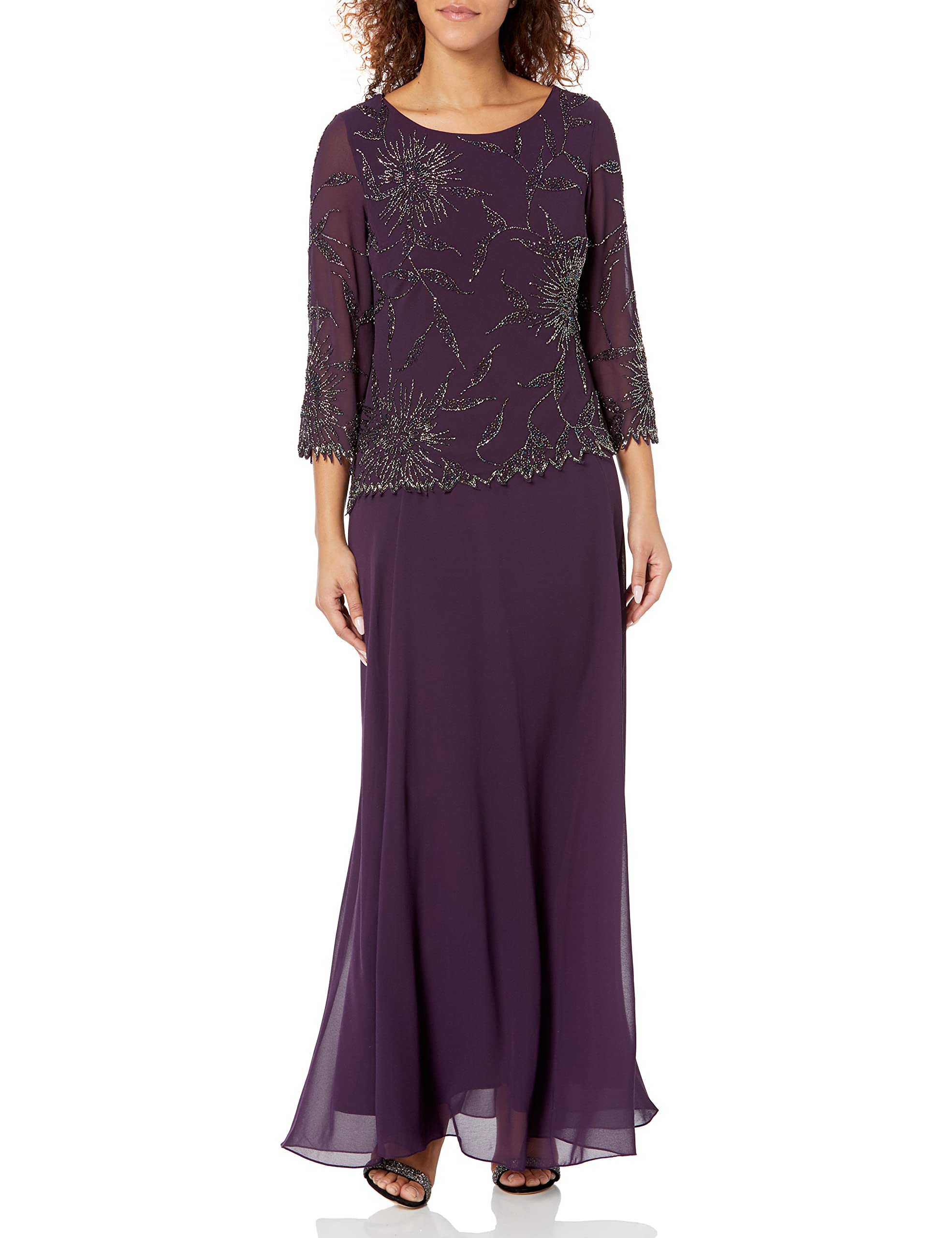 J Kara Women 3/4 Sleeve Beaded Floral Asymmetrical Dress Plum/Shaded/Mercury, 8