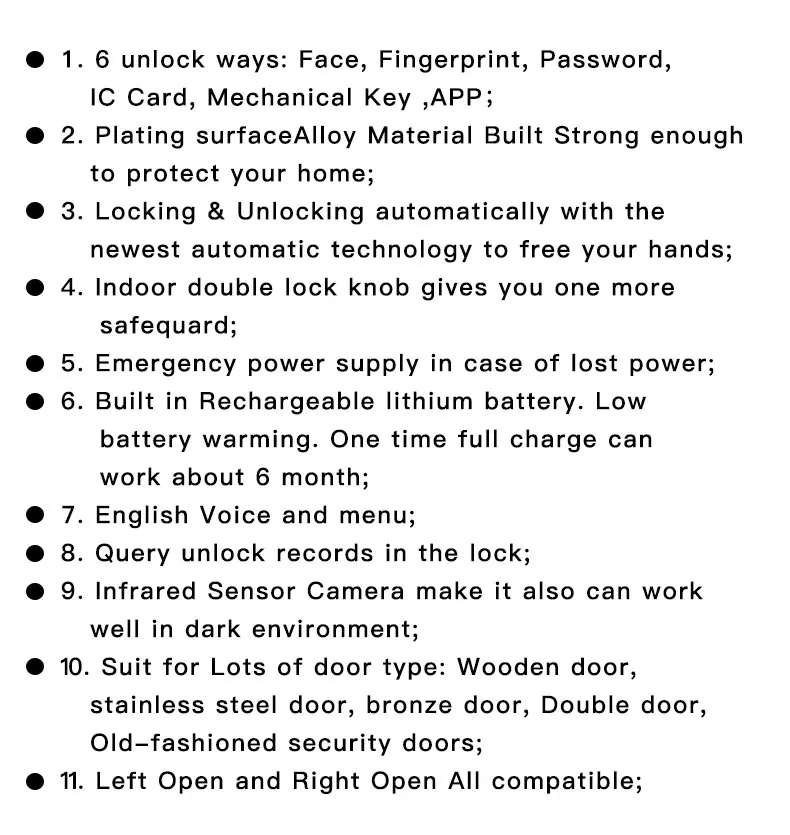 Material: Zinc Alloy panel and pure stainless steel lock body Product Type: 3D Face Recognition Smart Door Lock Installation Environment: Compatible with various door types including wooden, metal, iron, steel, and aluminum Operating Temperature: Functional in a range of -15°C to 65°C Waterproof Level: IP67, ensuring resistance to water and dust Battery Life: Rechargeable 4200mAh lithium battery for 3-6 months of use Features: The Tuya Wifi 3D Face Recognition Smart Door Lock is a cutting-edge solution for home and office security. With its innovative 3D face recognition technology, this smart lock provides a secure and convenient way to access your property. The inclusion of a video doorbell feature adds an extra layer of security, allowing you to monitor and communicate with visitors even when you're not at home. **Versatile and User-Friendly** This smart door lock is designed to cater to a diverse range of users, offering support for 12 languages including Hebrew English Russian Korean Portuguese Spain Indonesian Traditional Vietnamese Arabic French German Thai. Its compatibility with various door thicknesses from 3.5cm to 10cm makes it suitable for a wide range of door types. The lock's ability to be installed on both left and right-opening doors is an added convenience. With a rechargeable battery that lasts for 3-6 months, this smart lock ensures that you have peace of mind without the constant need for replacements or maintenance. The Tuya Wifi 3D Face Recognition Smart Door Lock is not just about security; it's also about ease of use. The lock's quick reading time of ≤0.5S means that you won't have to wait long to unlock your door. The inclusion of a USB emergency charging port and mechanical key backup ensures that you're never locked out. Whether you're looking to upgrade your home security or seeking a smart lock for your office, this product is an excellent choice for those who value both security and convenience.