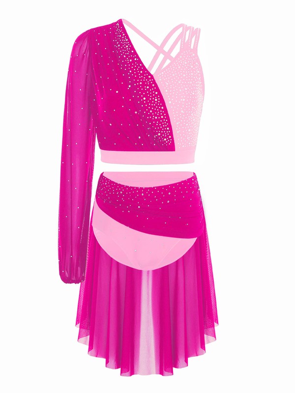 The single-sleeve crop top design is both trendy and unique, adding a modern edge to the traditional dance outfit and making the wearer stand out.