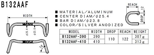 NITTO drop handle B132AAF B132AAF-390 φ25.4 390 Silver Japan Description WIDTH: 390 · DROP: 110 · REACH: 122
