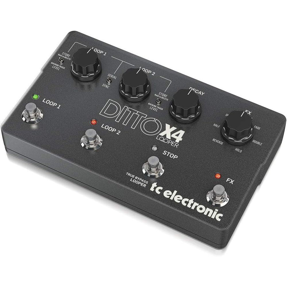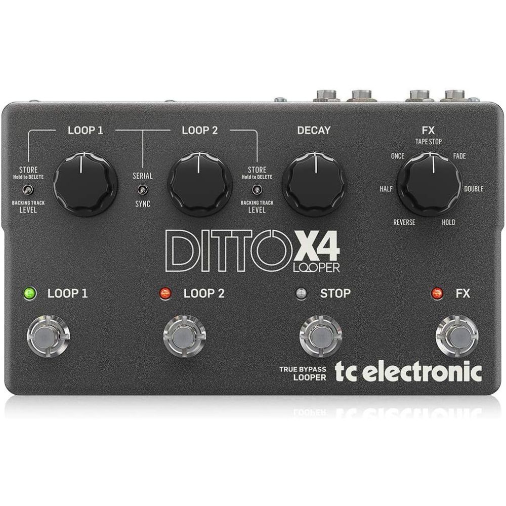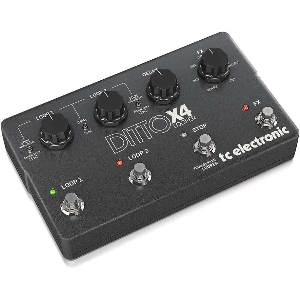 Each independent loop track offers up to five minutes of audio. Adjustable loop decay lets you control your overdubs to create gradual fading or bold, in-your-face attitude depending on what the composition calls for. Four convenient footswitches provide control over Loop 1, Loop 2, FX, and the Stop function, which lets you stop your loops with precision. The Ditto X4 Looper sports stereo 1/4" I/O for stereo signals or processing two inputs at once, MIDI I/O for external tempo sync, and USB connectivity for importing and exporting loops or backing tracks. And with selectable true or buffered bypass, you can enjoy pristine, uncolored audio (true bypass) or a propped up signal that can handle long cable runs and complex pedalboards with ease (buffered bypass).