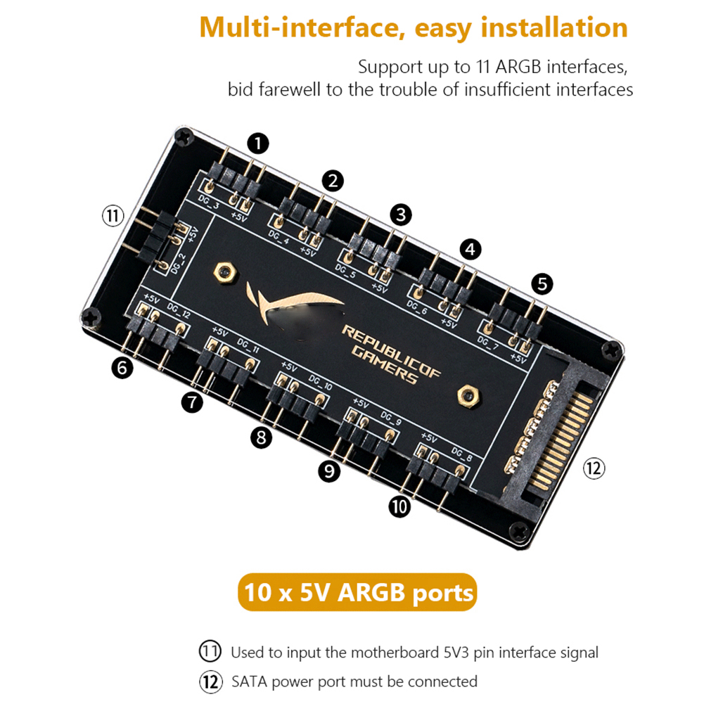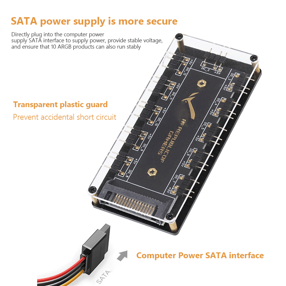 4. The hub is a 5V 3PIN SATA/large 4D power port version. Specifically, it depends on the interface on the motherboard and the number of pins of the device interface you are using. You can purchase it accordingly. You cannot connect a three-pin four-pin device or a four-pin hub to a three-pin lighting device.