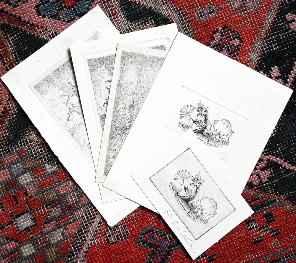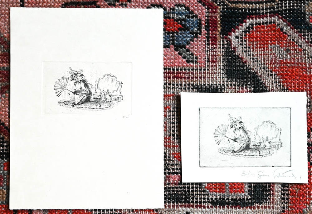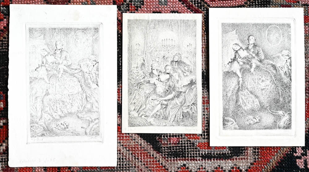 - Zwei Variante einer Vignette, die einen Affen mit Fächer vor einem Schminktisch zeigt (einmal mit wohl einer zusätzlichen Widmung). Zwei Varianten einer Szene in der eine Rokoko-Dame ohnmächtig wird, einmal bezeichnet als "1. Zustand" mit kleinen Hinweisen zum Druck. Ein weiteres Blatt mit Rokoko-Gesellschaft in grossem Saal mit Kerzenleuchtern, unten wieder Angabe zum Zustand. Alle Blätter in Bleistift signiert oder bezeichnet.