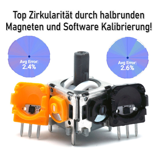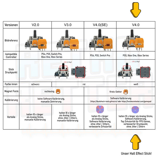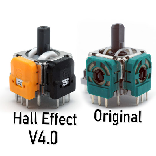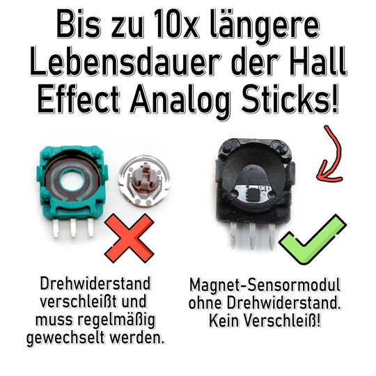 Hall Effect Sticks arbeiten mit einem verschleißfreien Magnet-Modul an Stelle des Potentiometers, und haben somit eine 10x längere Lebensdauer als die Original Analog Sticks.