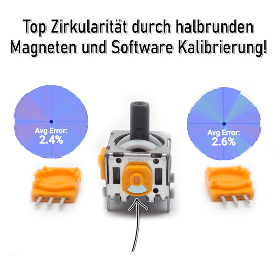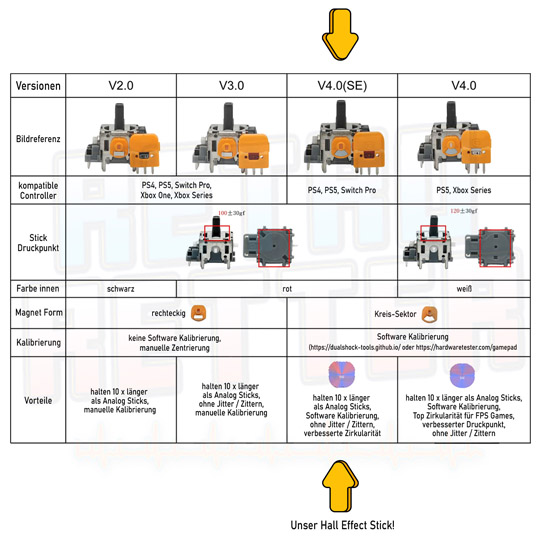 Hall Effect Sticks arbeiten mit einem verschleißfreien Magnet-Modul an Stelle des Potentiometers, und haben somit eine 10x längere Lebensdauer als die Original Analog Sticks.