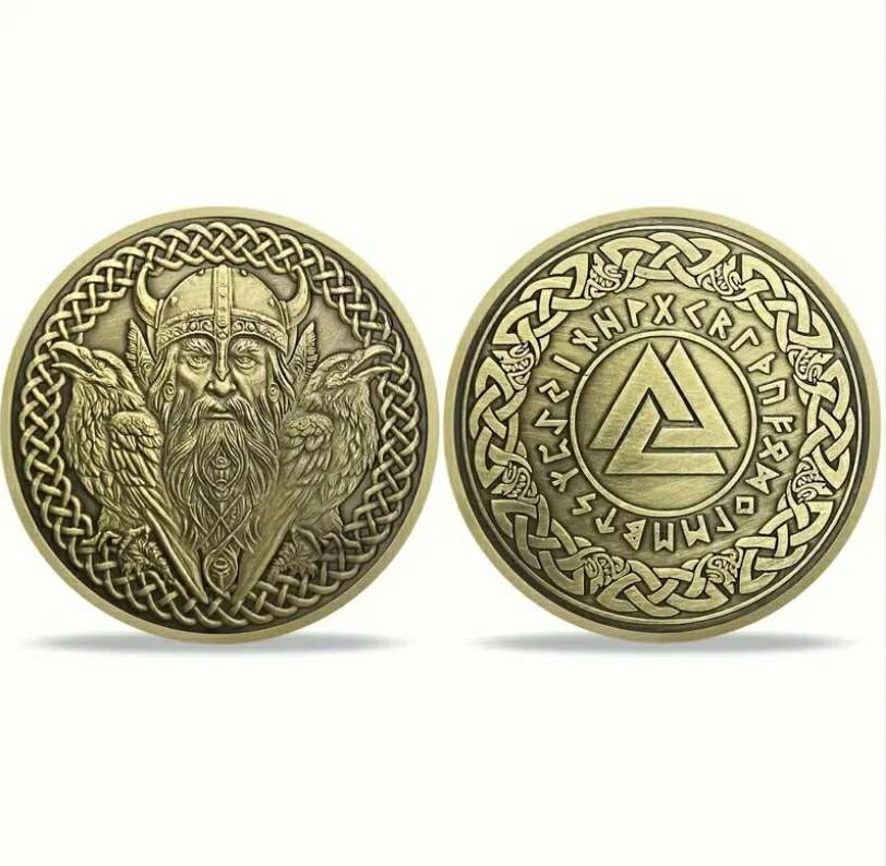 On one side, the powerful bearded Viking stares forward with an unshakable gaze, surrounded by intricate knotwork and his loyal birds, symbolizing thought and memory (Huginn and Muninn). The reverse side displays a bold Valknut symbol, encircled by ancient runes and interwoven Nordic designs, signifying Odin's presence, warrior legacy, and the journey to Valhalla.