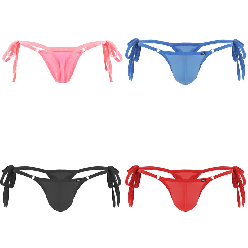 Low-rise with stretchy waistband, front with a red stitched bowknot and bulge pouch.