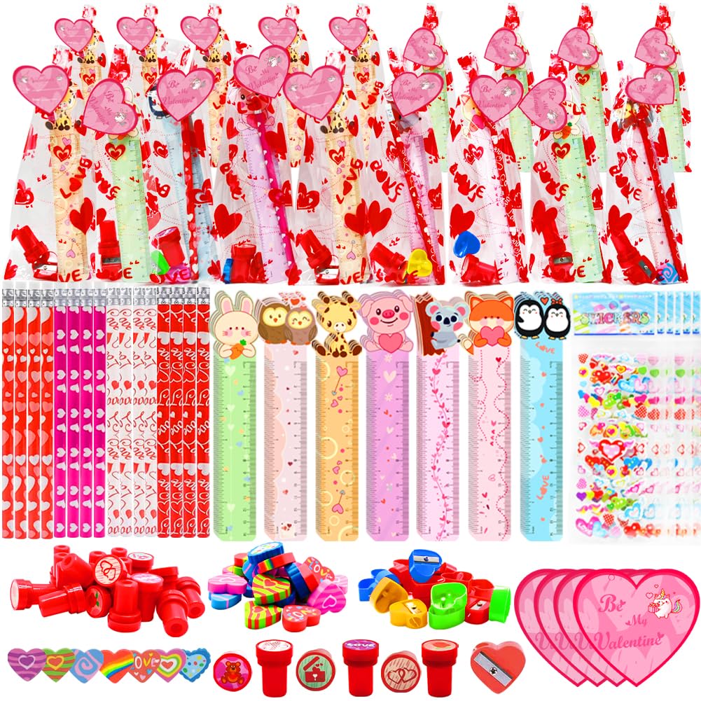 28 Pack Valentines Day Cards Stationery Set,, Gift Bag with Pencil Cards Stamper Eraser Ruler Sharpener for Kids Valentine Gifts Exchange Classroom Prize Party Favors