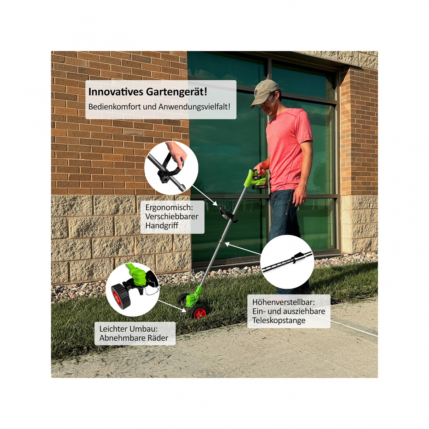 Mit dem Rotorazer 8in1 Gartengerät gehören diese Probleme der Vergangenheit an. Das akkubetriebene, kabellose Gartengerät vereint 8 Funktionen in Einem: Rasenmähen, Trimmen, Freischneiden, Rasenkanten schneiden, Hecken schneiden, Äste abschneiden, Holz sägen und sogar Unkraut beseitigen. Nie war Gartenpflege so einfach und schnell! Dank des einfachen Umbaus vom Rasenmäher zum Trimmer – sie müssen nur die Räder abnehmen – haben Sie ein flexibles, vielseitiges Werkzeug, das in kürzester Zeit einwandfreie Ergebnisse liefert. Der Rotorazer 8in1 bietet Ihnen alles, was Sie für eine effiziente Gartenpflege benötigen.