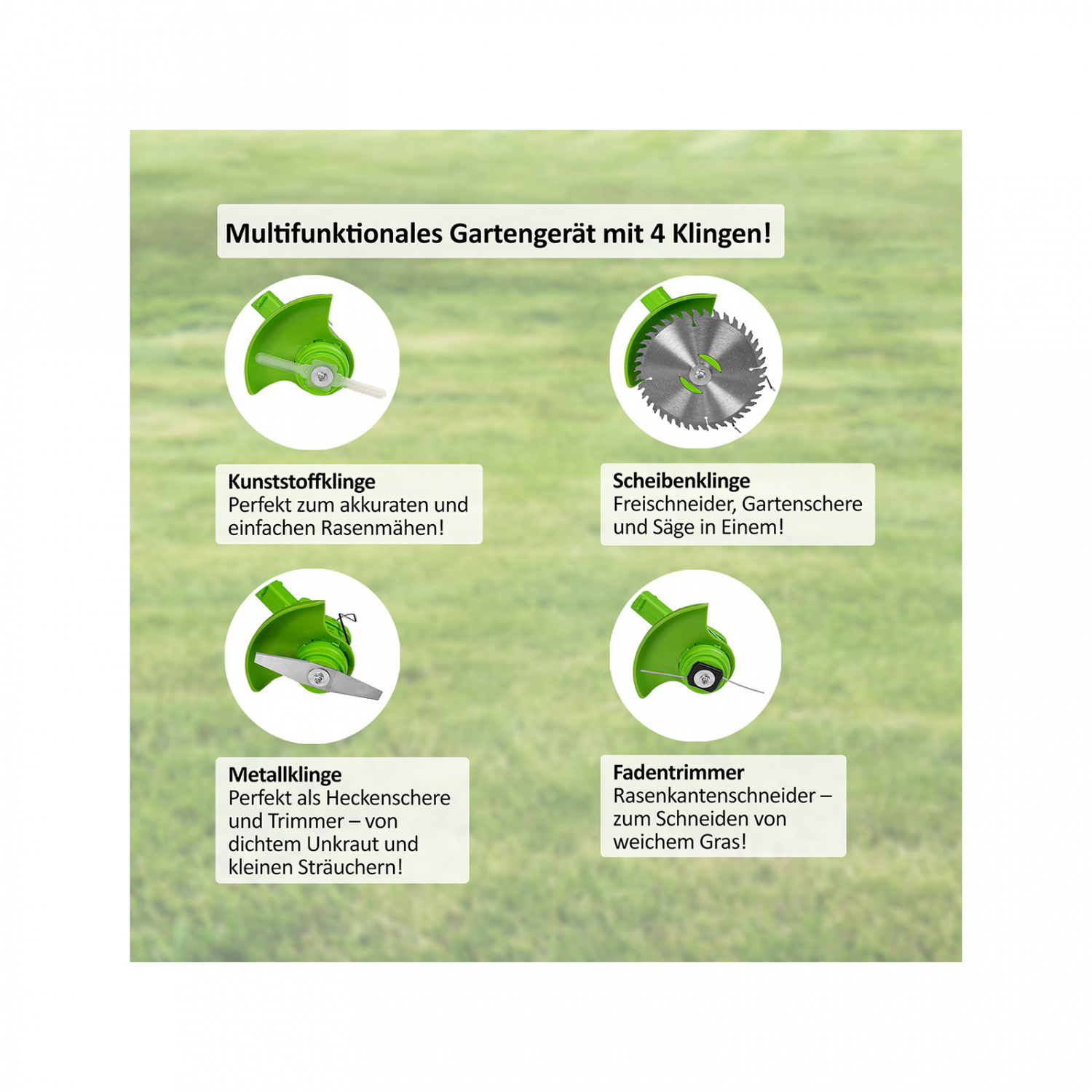 Mit gleich 3 Arten von messerscharfen Klingen und dem Fadentrimmer haben Sie für jede Anforderung die passende Ausrüstung parat. Die Metallklingen sind ideal für dichtes Unkraut, Scheibenklingen eignen sich für dickere Sträucher und Äste, die Kunststoffklingen sind ideal zum Rasenmähen und der Fadentrimmer sorgt für saubere Schnitte bei feinem Gras. Rotorazer 8in1 ermöglicht jederzeit akkurate Schnitte – ob an hohen Ästen oder in Nischen wie z.B. um Zaunpfähle herum. Sichern Sie sich jetzt den Rotorazer 8in1 und heben Sie Gartenarbeit auf ein neues Level.