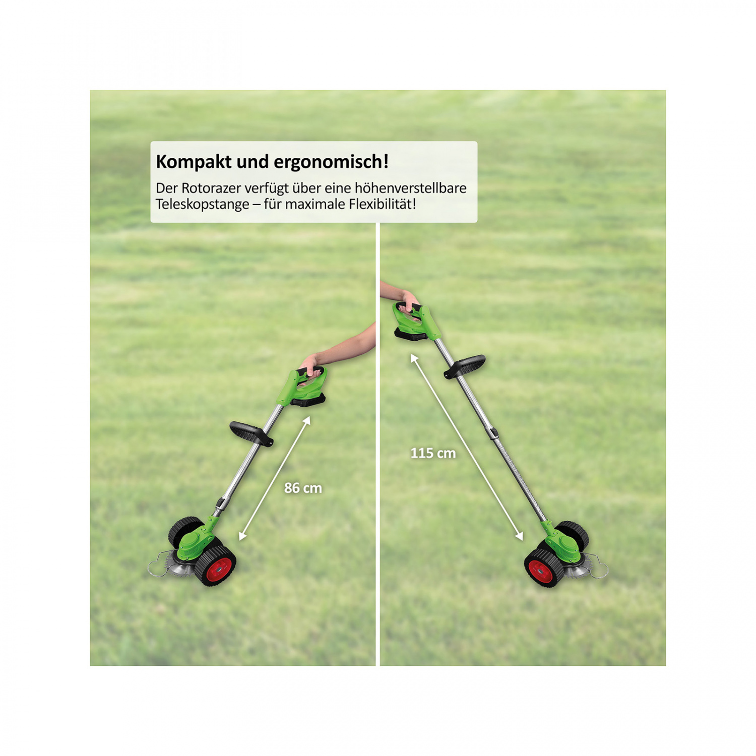 Der Rotorazer 8in1 ist perfekt an Ihre Bedürfnisse und die Arbeitsanforderungen in Ihrem Garten angepasst. So können Sie dank der ein- und ausziehbaren Teleskopstange (fest am Hauptgerät integriert) die ideale Arbeitshöhe (tief, mittel, hoch) einstellen und erreichen sowohl Nischen als auch besonders hohe Äste in Ihrem Garten. Der verschiebbare Handgriff ermöglicht dabei einen ergonomischen und festen Griff – ideal für längere Gartenarbeit. Der verstellbare Schwenkkopf bietet zudem einen perfekten Winkel zum Trimmen und Schneiden. Mit einem Gewicht von nur 2,75 kg lässt sich der kompakte Rotorazer überall leicht transportieren und ist stets griffbereit, wann immer Sie ihn brauchen.