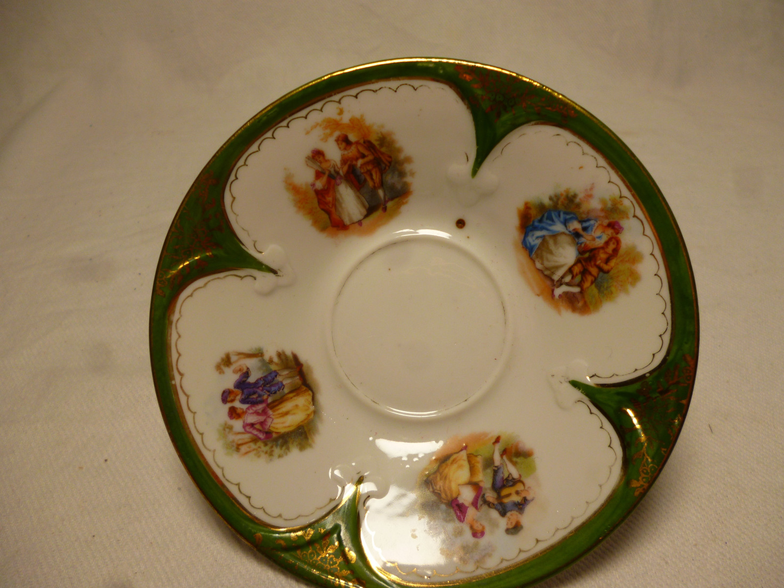 Untertasse mit leicht hochgezogenem Rand und plastischen Verzierungen