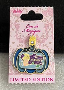 This pin is the second in the Eau De Magique Perfume Bottle series. It features Princess Cinderella and her perfume "Til' Midnight." It features a stained glass pumpkin like bottle with a jewel on the crown-stopper and a pin-on-pin featuring Cinderella in the center.