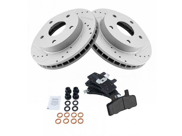 Package Contents: (1) Front Semi-Metallic Brake Pad Set; (1) Front Premium G-Coated Performance Brake Rotor Set