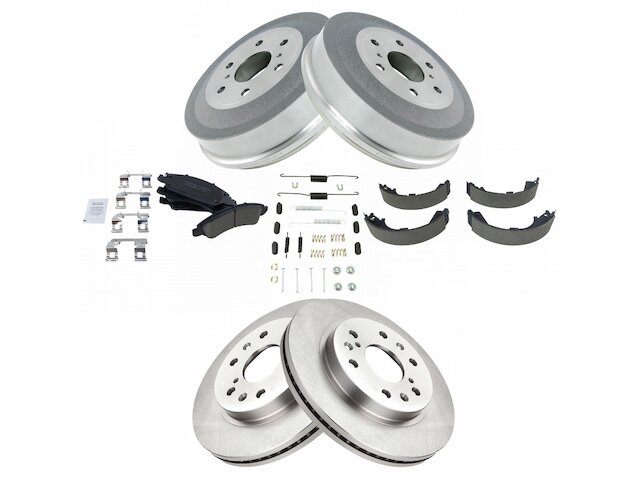 Package Contents: (2) Rear Brake Drums; (1) Rear Brake Shoe Set; (1) Rear Brake Hardware Kit; (2) Front Replacement Brake Rotors; (1) Front Ceramic Brake Pad Set; (1) Front Brake Hardware Kit