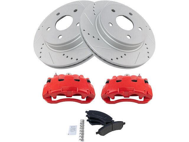 Package Contents: (1) Front Semi-Metallic Brake Pad Set; (2) Front Performance Brake Calipers; (1) Front Premium G-Coated Performance Brake Rotor Set
