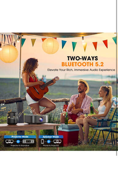 5G/2.4G Dual-Band WiFi 6 | Two-way Bluetooth 5.2: E2 projector with wifi and Bluetooth is powered by the latest Wi-Fi 6 technology, delivering smoother, lag-free streaming with 4X better efficiency than Wi-Fi 5 models. Enjoy gaming, high-resolution YouTube, and seamless screen mirroring from iPhone, iPad, Android, or Windows 10+ laptops without annoying stutters. Two-way Bluetooth 5.2—Connect external Bluetooth speakers for immersive, theater-quality sound or stream music from your phone to the Bluetooth projector's built-in speaker, turning it into a standalone Bluetooth speaker for parties, relaxation, or bedtime playlists. (Note: Bluetooth supports audio only, not video transmission.)