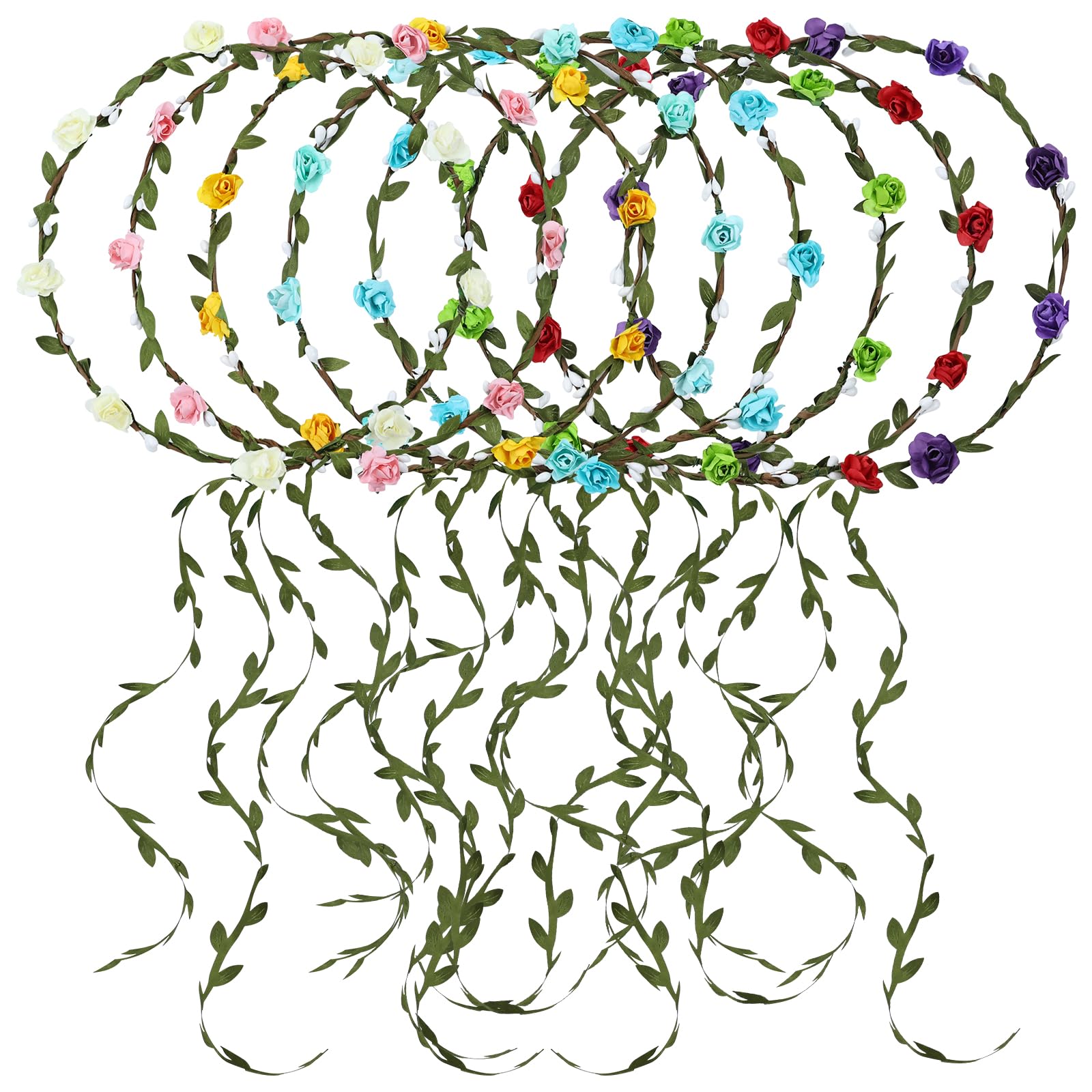 8 Pieces Party Festival Vacation Wedding Bridal Boho Flower Girl Crowns Tiaras Headbands with Leaf Ribbon Floral Hair Wreaths Garlands Headpieces for Women Girls Teens Kids