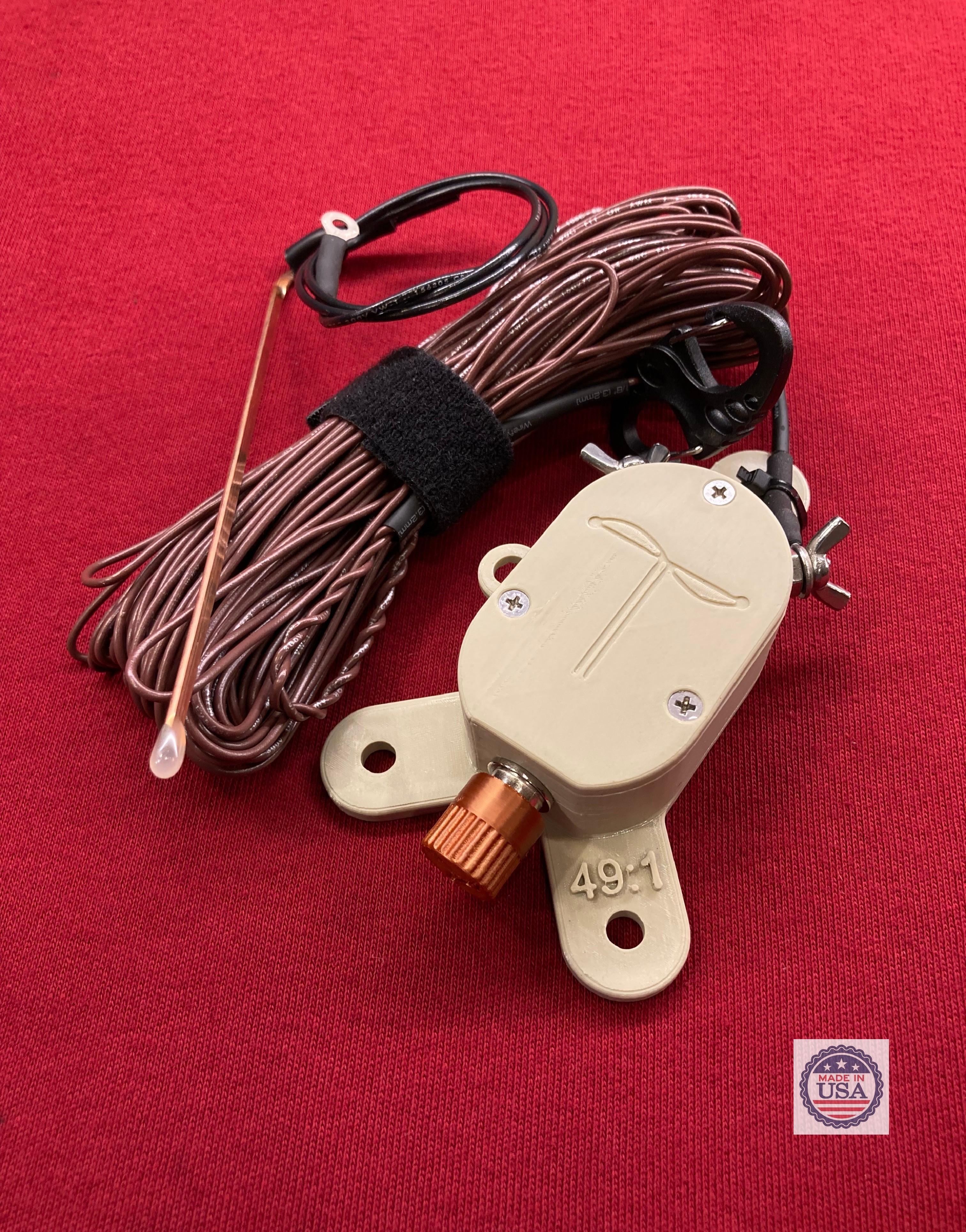 Impedance Matching: 49:1 transformer utilizing a Fair-Rite FT140-43 toroid core with a 2-turn primary bifilar winding, optimized for efficient 100 Watt (50 CW / 25 Digital) power transfer across bands.