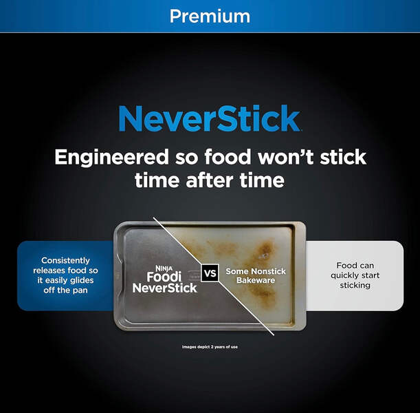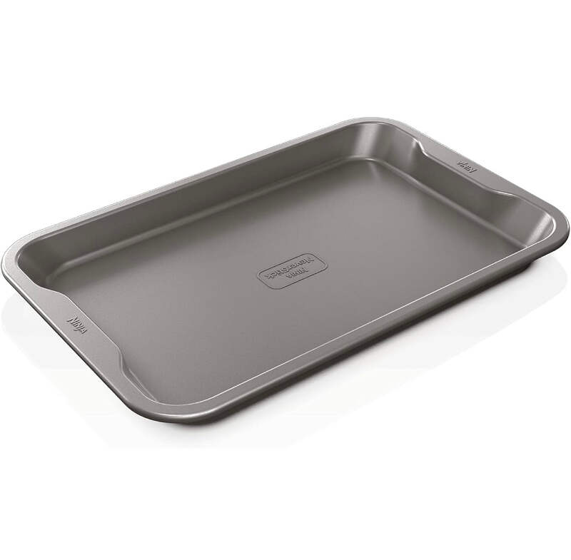 Top highlights Color Gray Material Steel Size 9"x13" Cookie Pan Brand Ninja Product Dimensions 14.88"L x 9.92"W x 1.18"H Item Weight 1.6 Pounds NEVERSTICK BAKEWARE: Engineered to consistently release food so it easily glides off the pan. HEAVY-DUTY ALUMINIZED STEEL: Heavy gauge 0.8mm aluminized steel minimizes rusting and staining. 10 YEAR GUARANTEE: Durable NeverStick coating delivers long lasting performance and is fully backed by the Ninja 10 Year Guarantee* *When used as directed. OVEN SAFE TO 500⁰F: Premium thick construction is high-heat friendly and resists warping in the oven. PERFECT RESULTS: Uniformly distributes heat for professional results and even browning on sweet treats and savory dishes. EASY CLEANUP: NeverStick Bakeware is dishwasher safe and features rounded corners that easily wipe clean. COMFORTABLE GRIP: Wide, ergonomic rims are easy to handle with potholders or oven mitts. THOUGHTFUL DESIGN: Deep walls eliminate spills and protect your baked goods as they’re removed from the oven. SAFE MATERIALS: PFOA-free, non-toxic coating is made without hazardous chemicals. WHAT’S INCLUDED: 9x13” Baking Sheet.