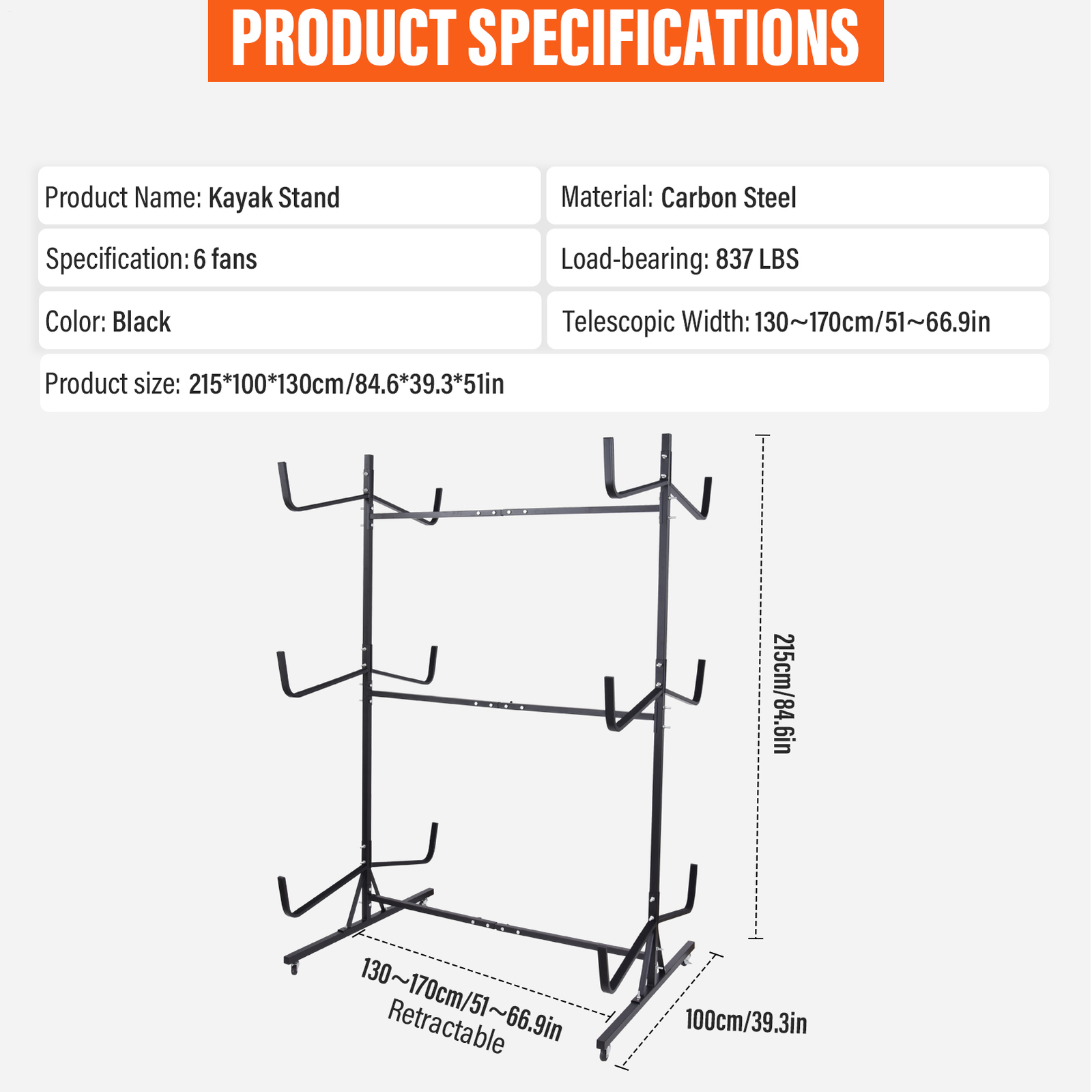 Effortless Organization: Expertly designed to hold 6 kayaks, this rack supports up to 837 pounds with a rust-resistant, heavy-duty steel construction and a stable triangular base