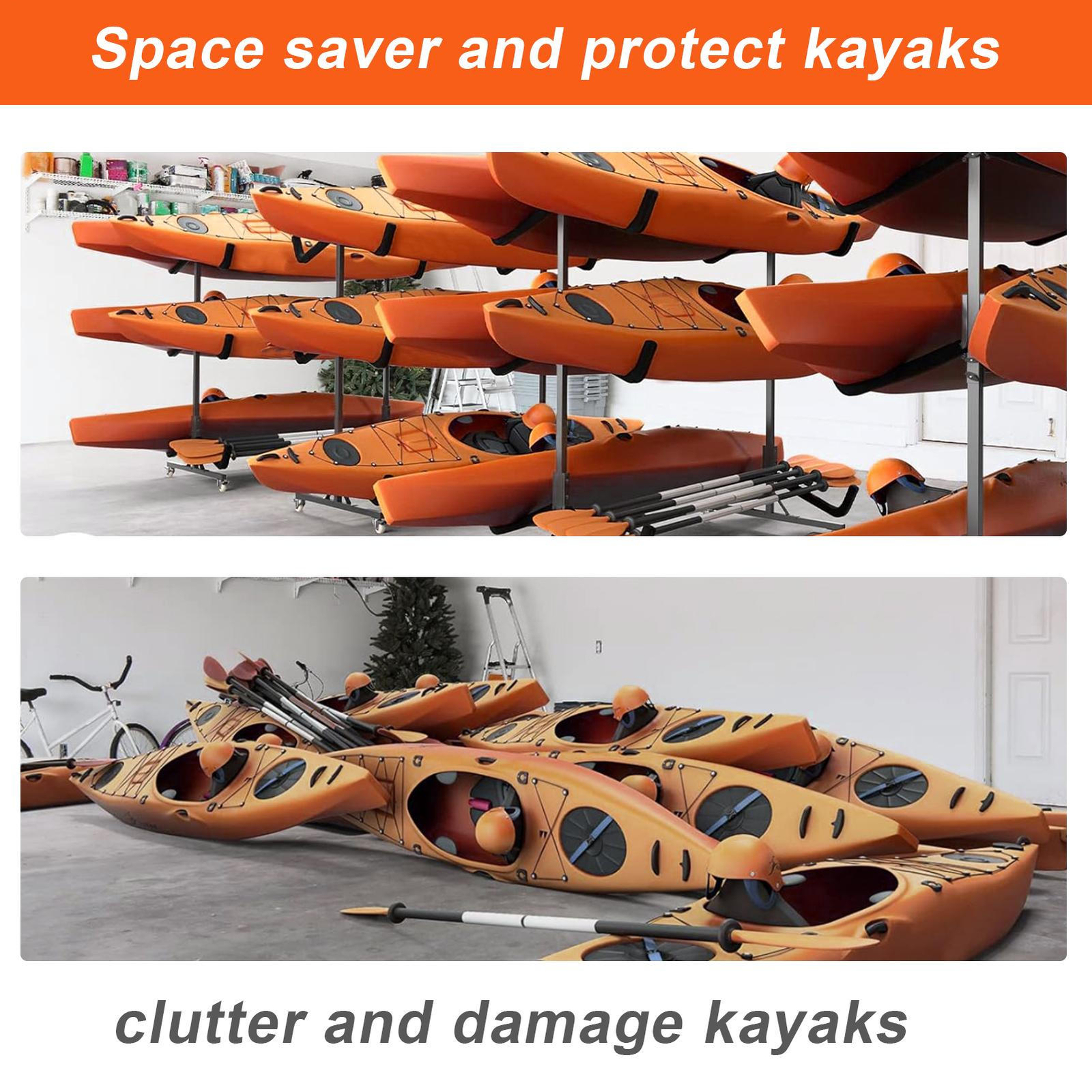 Our Kayak Rack easily accommodates up to 6 kayaks, with a weight capacity of 837lbs, while maximizing floor space. The adjustable design can also accommodate wider loads, saving time and effort in storage.