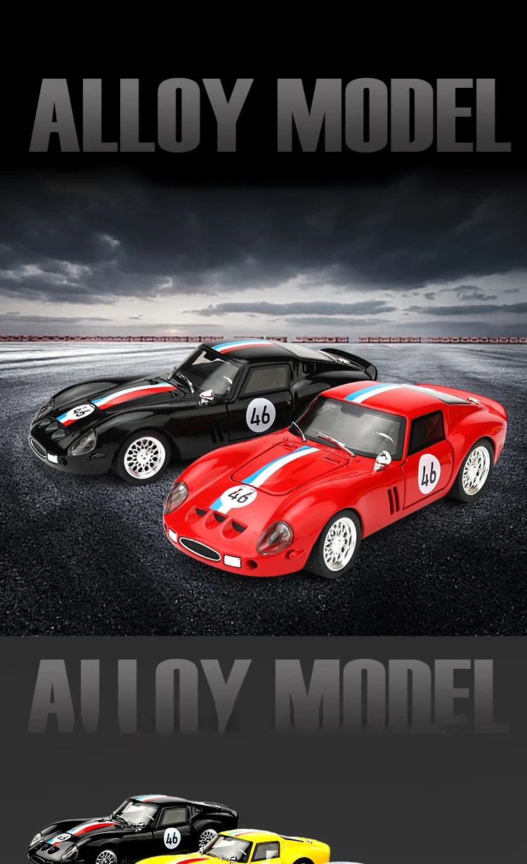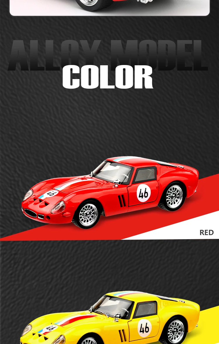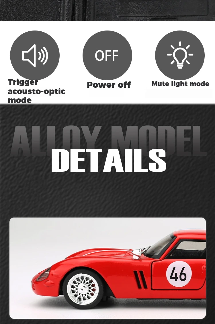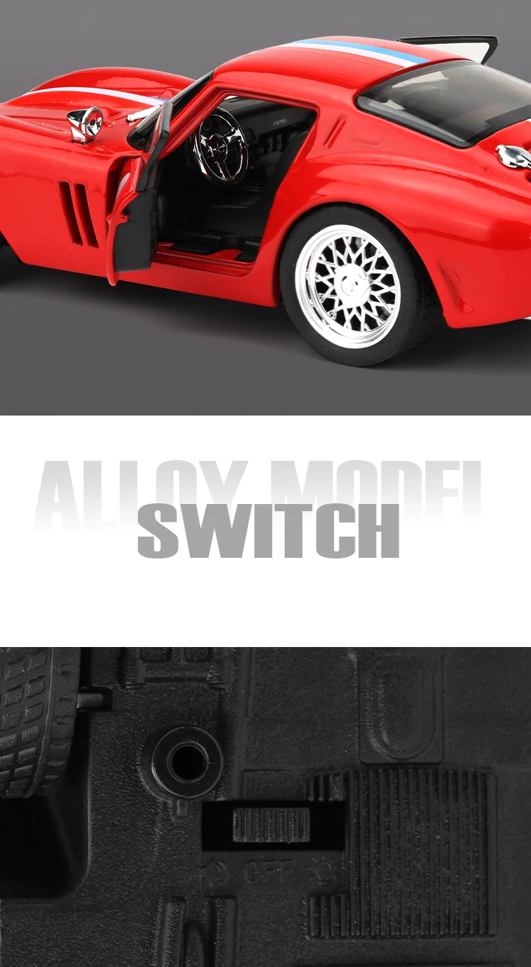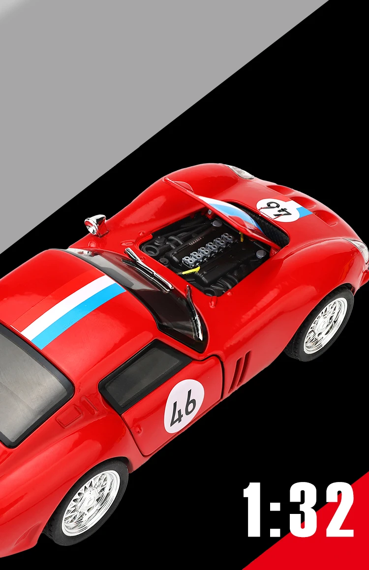 Material: High-quality Metal Features: Diecast Model with Light & Sound Recommend Age: Suitable for Adult Collectors, 18+ Years Battery: Button Battery Powered Category: Railed/Motor/Cars/Bicycles Design: 1:32 Scale Replica of the Iconic 250 GTO