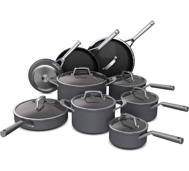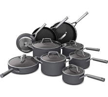 Top highlights Material Tempered Glass, Stainless Steel Color Slate Gray Brand Ninja Size 16pc set Handle Material Stainless Steel Is Dishwasher Safe Yes NEVERSTICK DIFFERENCE: Won’t stick, chip or flake. Super-heated at 30,000°F, plasma ceramic particles are fused to the surface of the pan, creating a super-hard, textured surface that interlocks with our exclusive coating for a superior bond HARD-ANODIZED EXTERIOR: This premium cookware has an extremely durable shot-blasted, hard-anodized exterior that resists scratches like stainless steel. OVEN SAFE: Easily go from stovetop to oven to finish cooking meats, brown toppings, or bake like you can in cast iron. Lids, handles and nonstick coating are all oven safe up to 500°F. PREMIUM DESIGN: Stainless-steel handles are ergonomically designed for comfort and double-riveted for strength and maneuverability. The tempered glass lid has a 13-mm-thick stainless-steel rim to lock in moisture and ensure maximum visibility. IMPROVED HEAT RETENTION: The heavy-gauge 4.5 mm aluminum base is designed to prevent hot spots and to enable quick, even heat distribution for perfect results every time. Contains 30% more aluminum than Ninja Foodi NeverStick Essential C100 series. SEARS LIKE STAINLESS: Sear like you can in stainless steel, without needing additional oil or butter. Plus, sauté, griddle, pan fry, shallow fry, braise, bake, roast, and broil with this multifunctional cookware set. EASY CLEANUP: NeverStick cooking surface wipes clean and is easier to clean than traditional stainless pans. SAFE & EASY TO USE: Nonstick coating is metal-utensil safe, easy to wipe clean and dishwasher-safe. Made with only FDA-approved food-safe materials. All range capable: compatible with gas, electric, glass ceramic, and induction stoves. WHAT’S INCLUDED: 8'' Fry Pan with Glass Lid, 10.25'' Fry Pan with Lid, 12'' Fry Pan, 1.5 qt. Saucepan with Lid, 2.5 qt. Saucepan with Lid, 3.5 qt. Saucepan with Lid, 3 qt. Sauté Pan with Lid, 4 qt. Stock Pot with Lid & 8 qt. Stock Pot with Lid.