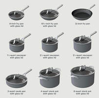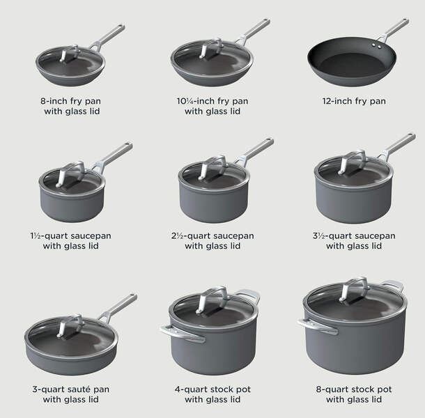 WHAT’S INCLUDED: 8'' Fry Pan with Glass Lid, 10.25'' Fry Pan with Lid, 12'' Fry Pan, 1.5 qt. Saucepan with Lid, 2.5 qt. Saucepan with Lid, 3.5 qt. Saucepan with Lid, 3 qt. Sauté Pan with Lid, 4 qt. Stock Pot with Lid & 8 qt. Stock Pot with Lid.