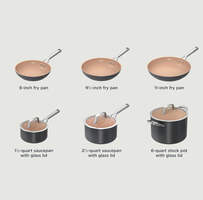 • WHAT’S INCLUDED: 9.5" Frying Pan, 2.5qt Saucepan with Glass Lid, & 6qt Stock Pot with Glass Lid, 8" Fry Pan, 11" Fry Pan, 1.5qt Saucepan with Glass Lid.