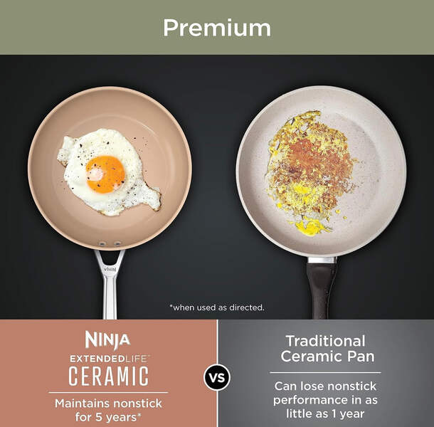 Top highlights Material Ceramic Color Apricot Brand Ninja Size 9 Piece Set Handle Material Metal Is Dishwasher Safe Yes CERAMICLOCK COATING: Dual-bonded coating preserves the nonstick performance for years while traditional a ceramic nonstick cookware set can wear out quickly. SAFE & HEALTHY COOKING: Stock pots, non stick frying pans, and saucepans require little to no oil or fat when cooking. Ninja cookware is made without harmful chemicals, PFAS, PFOA, lead, or cadmium. PEACE OF MIND: Made without harmful chemicals, PTFE, PFOA, lead, or cadmium. DURABLE EXTERIOR & EASY CLEAN-UP: The ceramic non stick pots and pan set has hard-anodized exterior and durable coating that easily wipes clean and is dishwasher safe. OVEN SAFE TO 550°F: Oven safe pots and pans can easily go from stovetop to oven or broiler. The induction cookware is compatible with gas, electric, glass ceramic, and induction stovetops. WHAT’S INCLUDED: 9.5" Frying Pan, 2.5qt Saucepan with Glass Lid, & 6qt Stock Pot with Glass Lid, 8" Fry Pan, 11" Fry Pan, 1.5qt Saucepan with Glass Lid. INDUCTION COOKWARE: Ninja induction compatible cookware sets also work great with gas, electric, and glass ceramic cooktops.