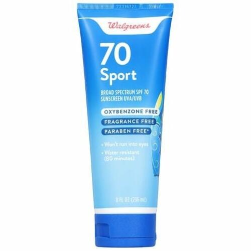 Broad Spectrum SPF 70 Sunscreen UVA/UVB Oxybenzone free. Fragrance free. Paraben free.* Won't run into eyes. Water resistant (80 minutes). Walgreens Pharmacist recommended.t walgreens.com. Questions or comments? 1-800-925-4733. tWalgreens Pharmacist Survey *No parabens separately added to preserve this product. Made in USA