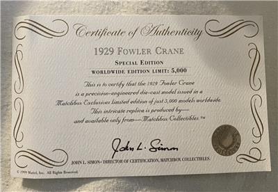 Offered for sale is a Matchbox 1929 Fowler Crane Collectors Limited Edition YYM36837 in the original box. This item is BRAND-NEW, never taken from the package other than to take the pictures. The sale also includes the Certificate of Authenticity.