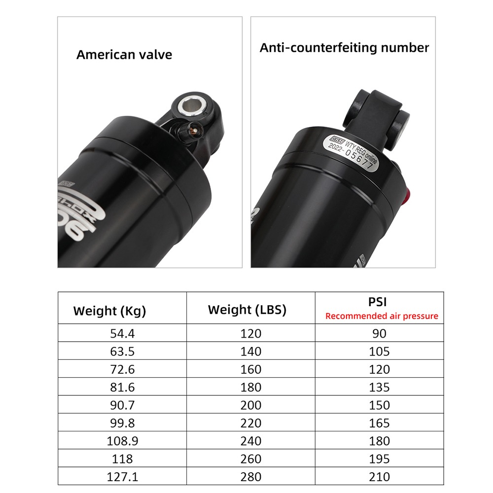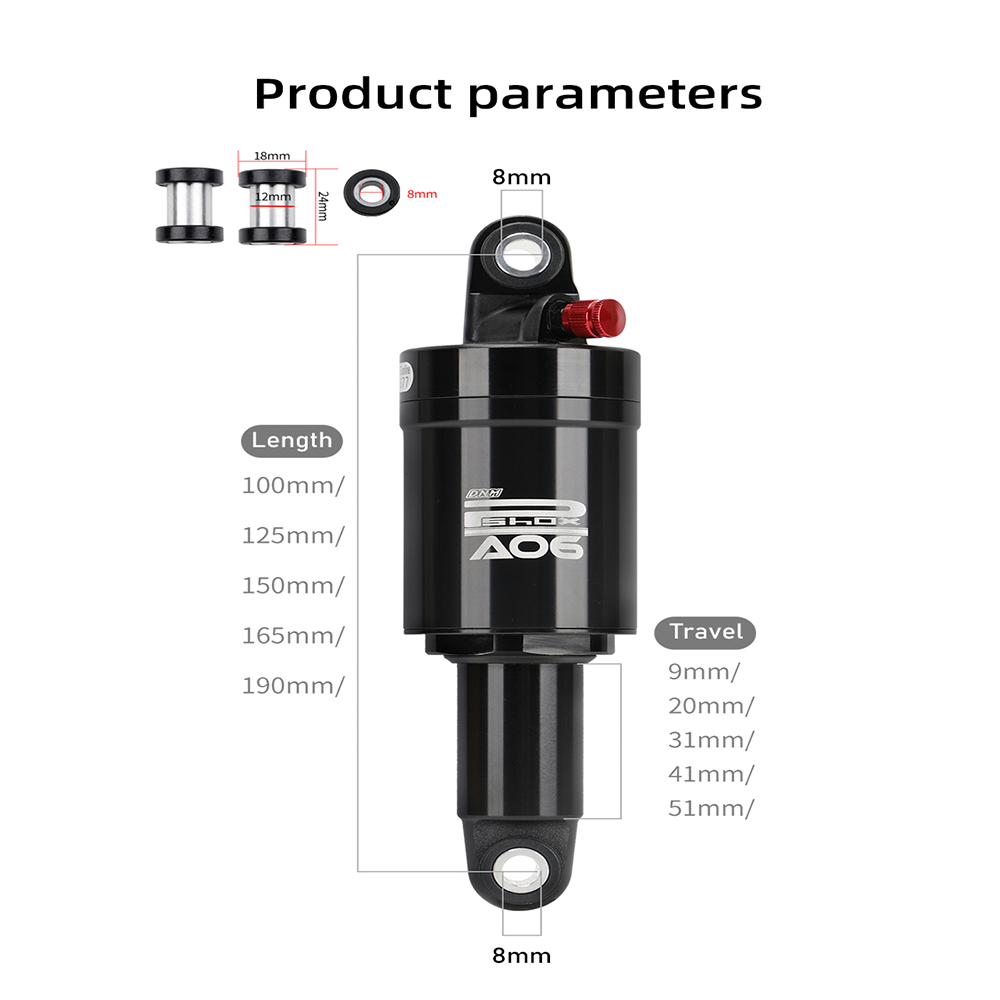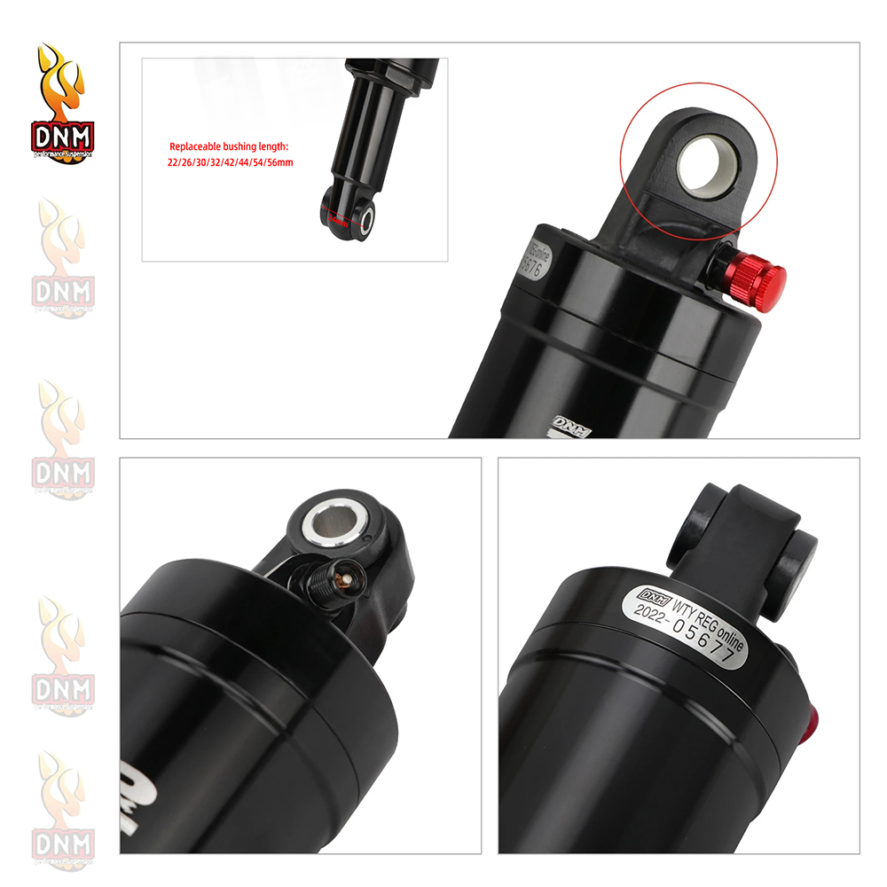 Specifications: Brand: DNM Model: AO-6 Origin: Taiwan Material: AL-6061 aluminum alloy Length: 125mm Travel: 9mm/20mm/31mm/41mm/51mm Weight: 288g Package includes: 1*DNM AO-6 Mountain Bike Air Rear Shock Absorbe 1*instructions 2 * 24mm inner liner