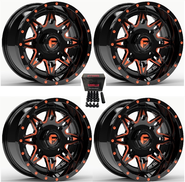 Fuel Lethal 14x7 ATV/UTV Wheel - Gloss Black/Orange (4/156) 4+3 [D6551470A544]. (Depending on the machine your stock lug nuts may not work with this wheel. They MAY require a different style lug nut that we offer) Center cap included.