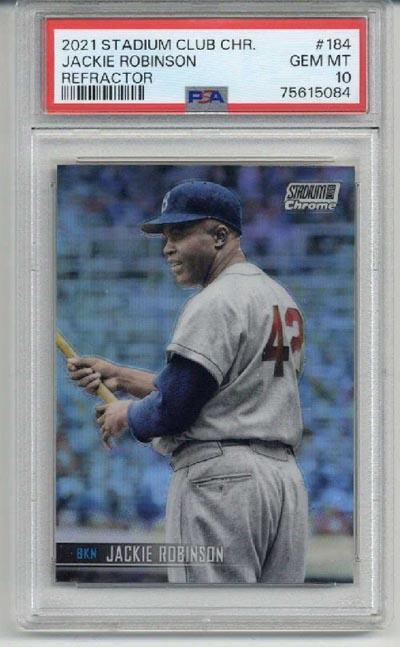 The item you are buying is a PSA GRADED and ENCAPSULATED 2021 Topps Stadium Club Chrome Refractor #184 card of Jackie Robinson. The card was graded a 10 by PSA. This card comes from my personal collection. The plastic of the encapsulation has no cracks and is scratch free.