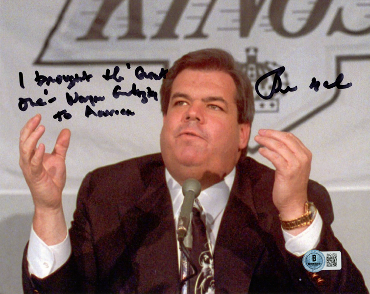 The item you are buying is a HAND SIGNED and BECKETT AUTHENTICATION SERVICES (BAS) AUTHENTICATED 10" x 8" photo of Bruce McNall. Mr. McNall added "I brought the "Great One" Wayne Gretzky to America" with his signature. The photo is printed on Kodak type professional paper and is in BRAND NEW/NEVER BEFORE DISPLAYED condition.