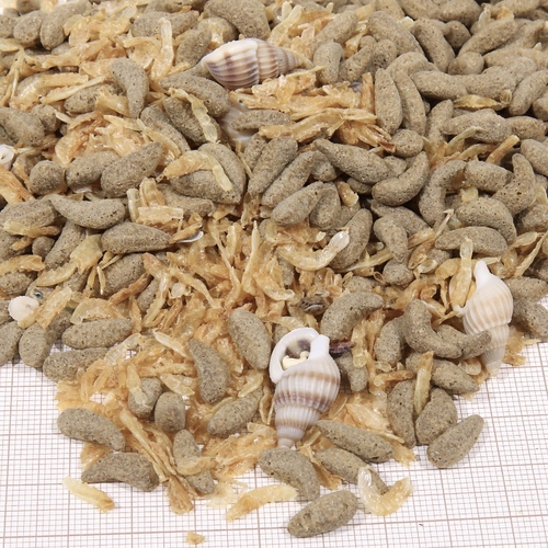 Garnele, Lachsmehl, Weizenmehl, Wasserschnecke, Maismehl, Sojamehl, Insektenprotein (Hermetia), Reismehl, Weizenkeimmehl, Garnelenmehl, Hefeextrakt, Grünlippmuschelmehl, Apfelfaser, Tintenfischmehl.