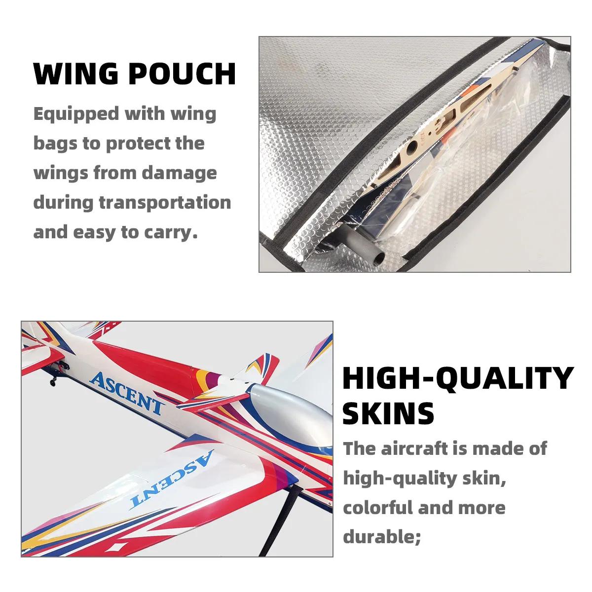 This balsa wood aircraft from design to commissioning, we focus on every detail, skin stamping strict requirements, the overall structure of the fuselage using carbon fiber plywood to strengthen the fuselage, equipped with a wing bag, carry protection and easy to travel, the wing is designed using an independent quick-release, the field is more convenient to install Whether from the appearance or performance, we are pursuing excellence, after a number of upgrades to the test flights, and now a stable flight! After many upgrades and test flights, now the stable flight performance allows you to control with confidence.