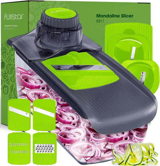 Fullstar Mandoline Slicer for Kitchen, Fruit Cutter, Cheese Grater, Cucumber Slicer, Veggie Spiralizer, Food Cutter & Kitchen Gadgets with Safety Glove (6 in 1, Gray/Green)