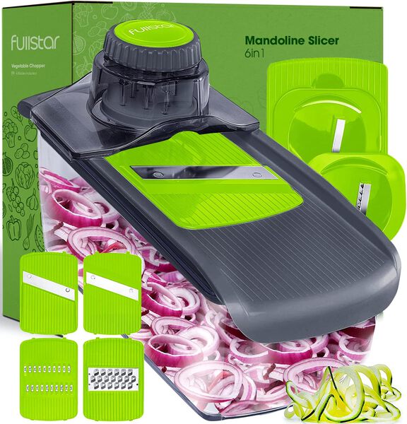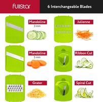 Brand fullstar Product Dimensions 14"L x 3"W x 6"H Material Stainless Steel, Plastic Color Gray/Green Special Feature Multipurpose Recommended Uses For Product Cheese, Vegetable Product Care Instructions Dishwasher Safe Blade Material Stainless Steel Item Weight 1.8 Pounds Blade Shape V-Shape About this item Greatest functionality on the market - 6 interchangeable blades meet all your slicing and grating needs whilst our spiralizers are perfect for zoodles, healthy vegetable pastas and gorgeous garnishes. Compact and practical - our vegetable mandoline slicer is designed for easy disassembly, allowing for quick and convenient storage. This versatile kitchen gadget is dishwasher safe, ensuring effortless cleanup. Additionally, it comes with a specialized cleaning tool to make removing any food residue a breeze, so you can spend less time cleaning and more time enjoying your meals. Keeping You And Your Family Safe - We know our julienne slicer and mandoline slicer stainless steel blades are high quality and razor sharp. It comes with a fingerguard and protective glove to keep you safe whilst you are using the vegetable mandoline slicer. The ABS plastic is nontoxic and BPA free! No Mess and No Slips - Our catch tray makes cooking so much more convenient, no mess and no messing around! It makes cleaning effortless and our non-slip base also makes your slicing and grating that much easier. A Kitchen Essential - Whether you're a novice cook or a seasoned pro, the Fullstar Food Chopper is a must-have in any kitchen. It's versatile, easy to use, and backed by our satisfaction promise. Please read the instruction manual provided with the Fullstar food chopper closely before use.