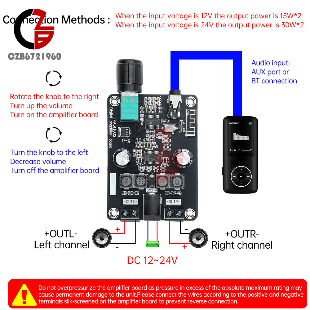 This model uses the original TPA3110D2 chip, paired with 5.0 Bluetooth for direct connection to mobile phones, with a maximum wireless transmission distance of 20 meters. DC port power supply: DC12~24V output power: 30W * 2 (30W * 2 at 24V, 15W * 2 at 12V), dual 30W output power meets most occasions. Pressure exceeding the absolute maximum rated value may cause permanent damage to the equipment. Long term exposure to absolute maximum rated conditions may affect the reliability of the equipment.
