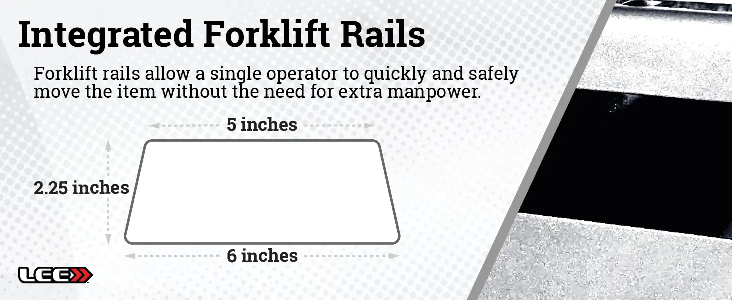 - Forklift rails for easy transporting and fits on a standard size pallet.