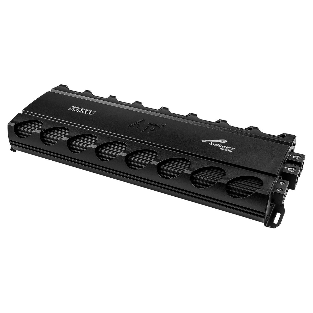 The APMQ-2000 is a compact Class D mono amplifier built for powerful and efficient audio performance. It delivers up to 2000 watts of peak power and features advanced MOSFET circuitry for strong output with low distortion. This amplifier includes a variable subsonic filter and low-pass filter, giving you full control over the frequency response of your system. With a remote bass knob included, you can adjust the subwoofer level from the driver's seat. LED indicators show power and protection status, and built-in safety features help protect against overload, overheating, short circuits, and low voltage. The small footprint makes it easy to install in most vehicles without taking up much space.