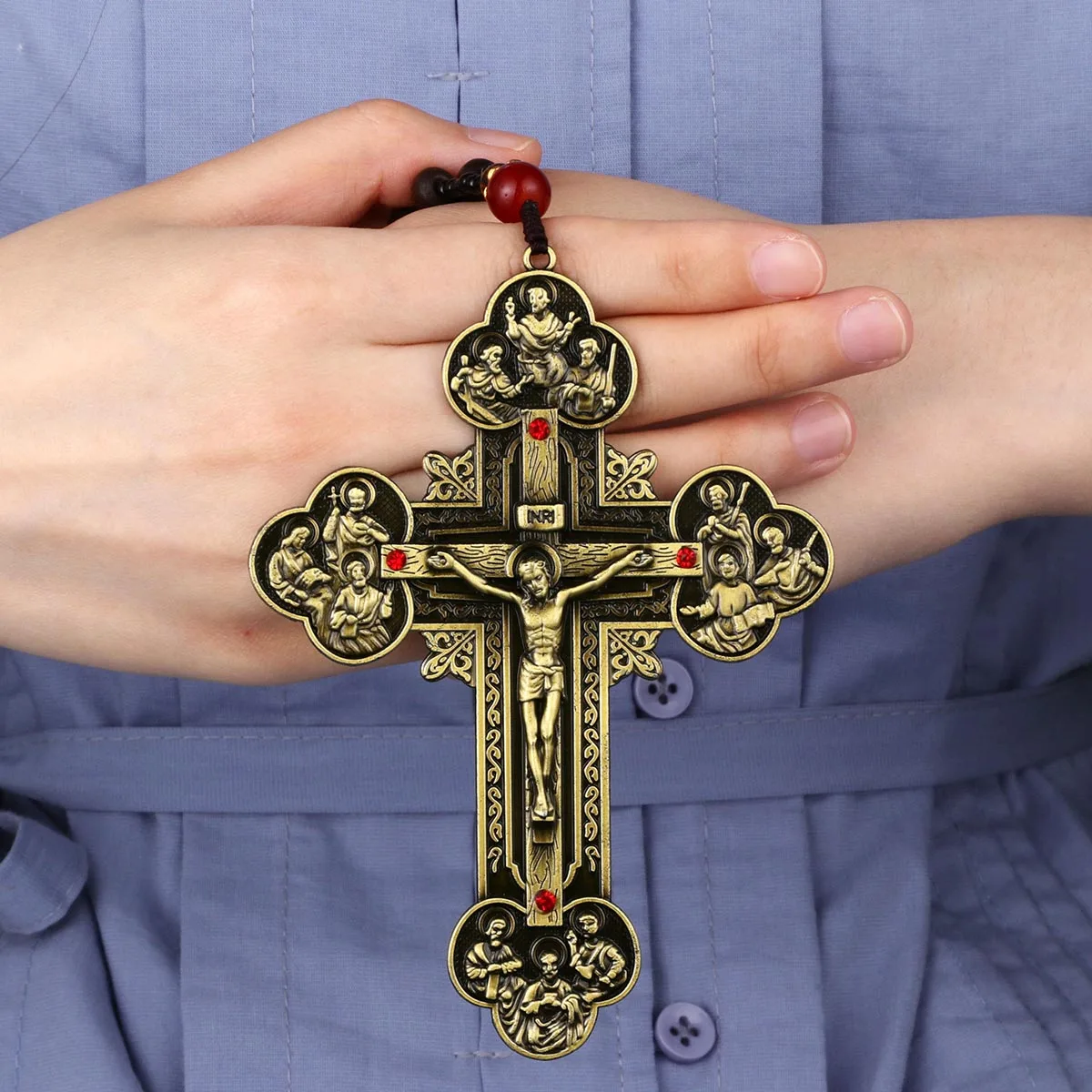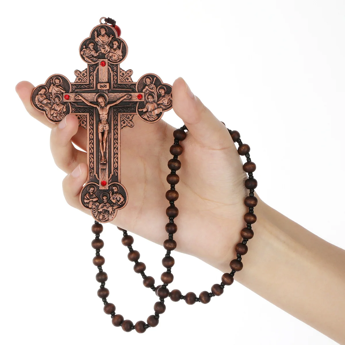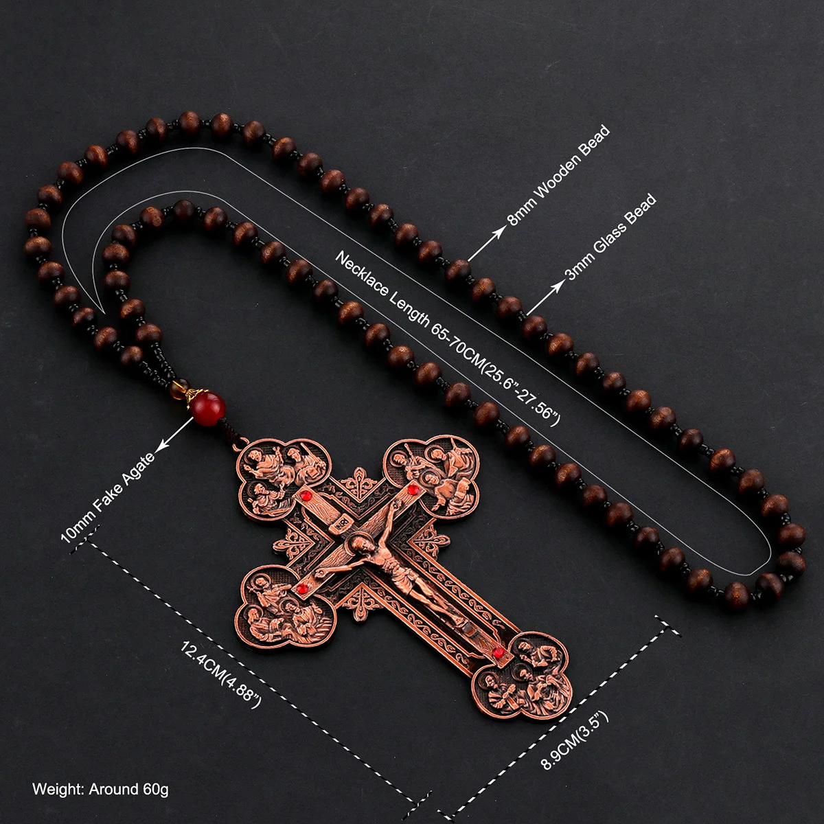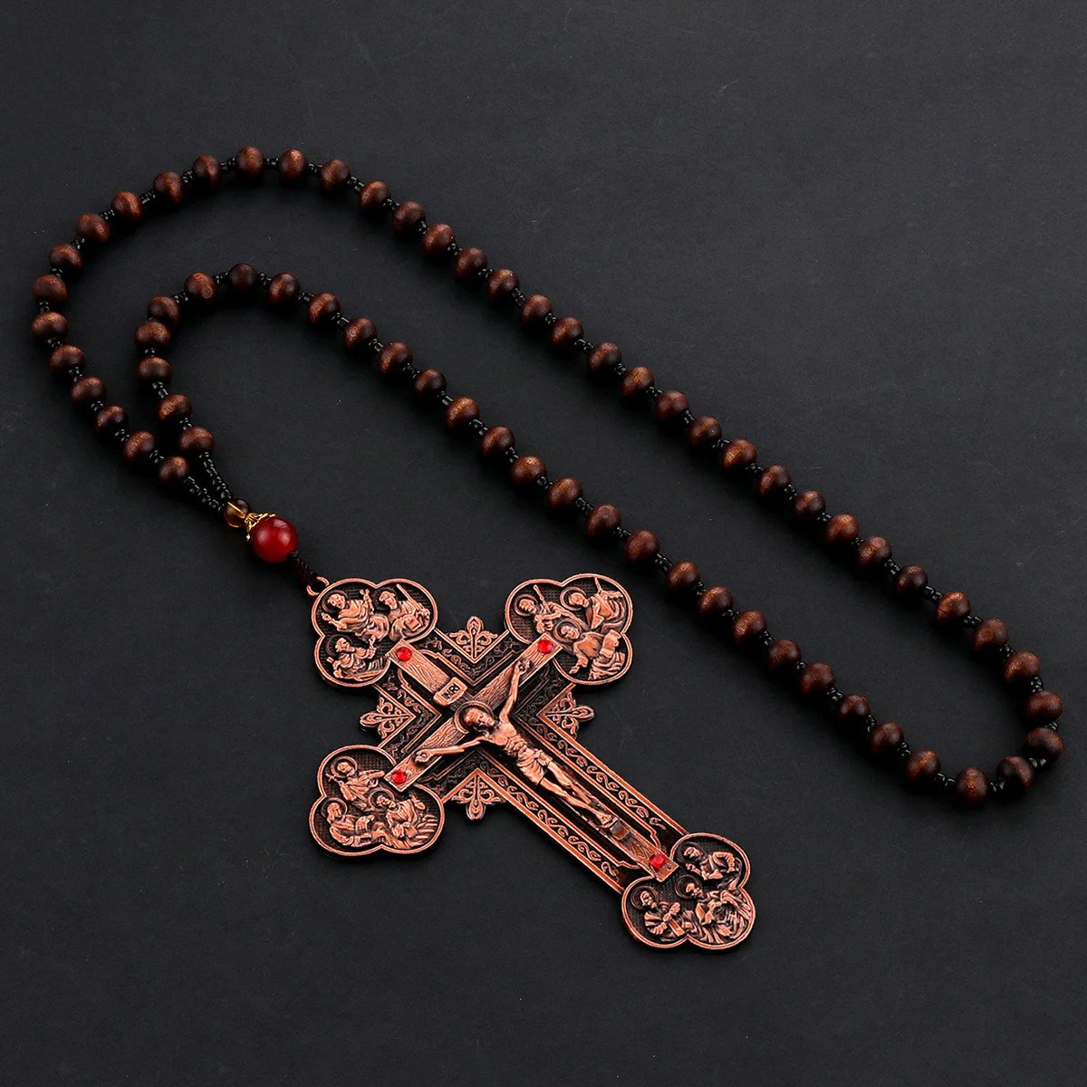 Orthodox Crucifix Pendant Necklace Wooden Rosary Beaded Chain Jesus Cross Gift