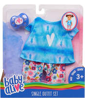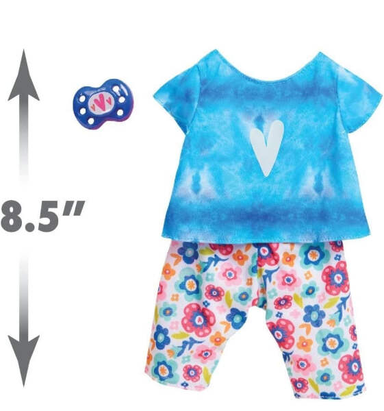 Denim Assortment includes: a pink t-shirt with tutu; a white top and multi-colored leggings; a floral print dress; a teal shirt and denim shorts. Each outfit sold separately. DOLL NOT INCLUDED. Pacifier Outfits fit most 12" - 14" dolls (not included) Made with soft fabrics. Outfit is removeable.