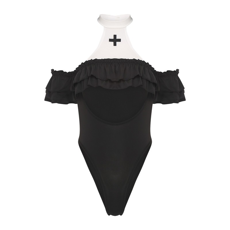 The mesh long-sleeve details give an edgy and mysterious vibe. Gold cross patchwork at the chest is a clear element of nun.